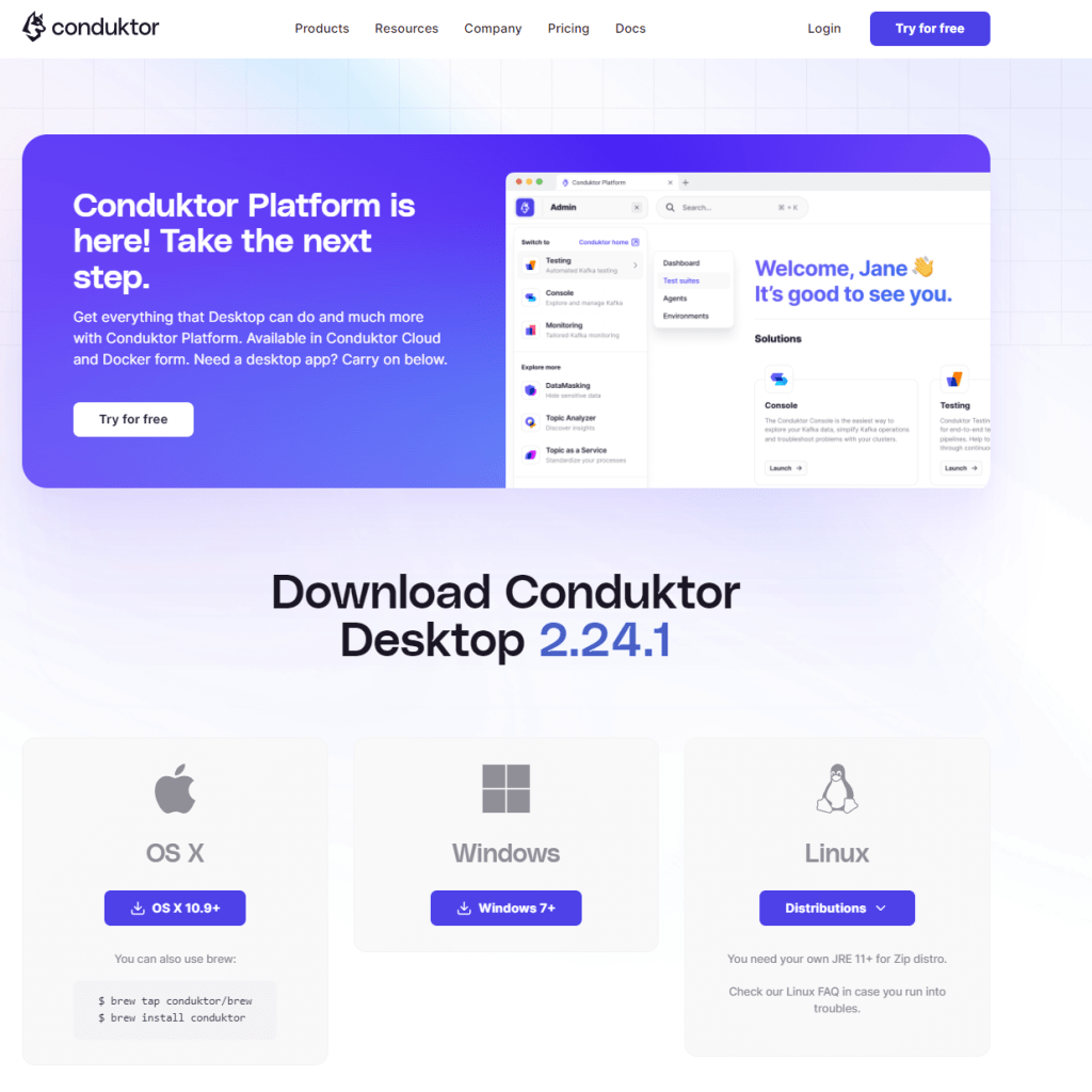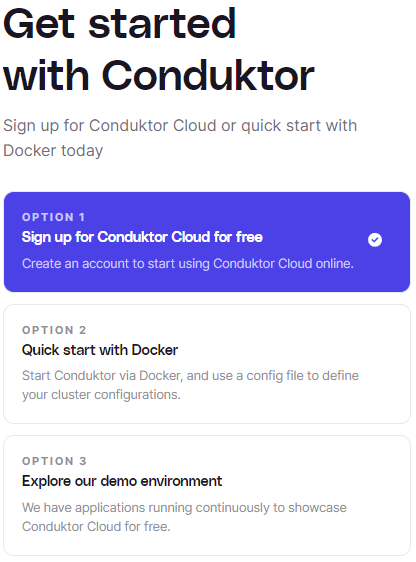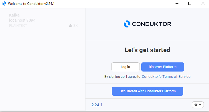 You will also need to register for a free account if you want to play around with it. The Conduktor Platform will allow you to link a Web Authentication Provider (Gmail for example) and you will have a trial to test the product (Option 1)